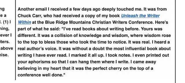 Yes. I’m that Chuck. And Cecil went on to write me a second email. And this morning I opened my email inbox and found his newsletter. I clicked. Surprised. I showed my computer screen to my wife. Her face lit up as well. Cecil Murphey had included part of my thank you letter in his newsletter sent to thousands. An author—that has written over 135 books—for some reason saw fitting to include a small piece of my heart and gratitude in something he passed out to who knows how many others.